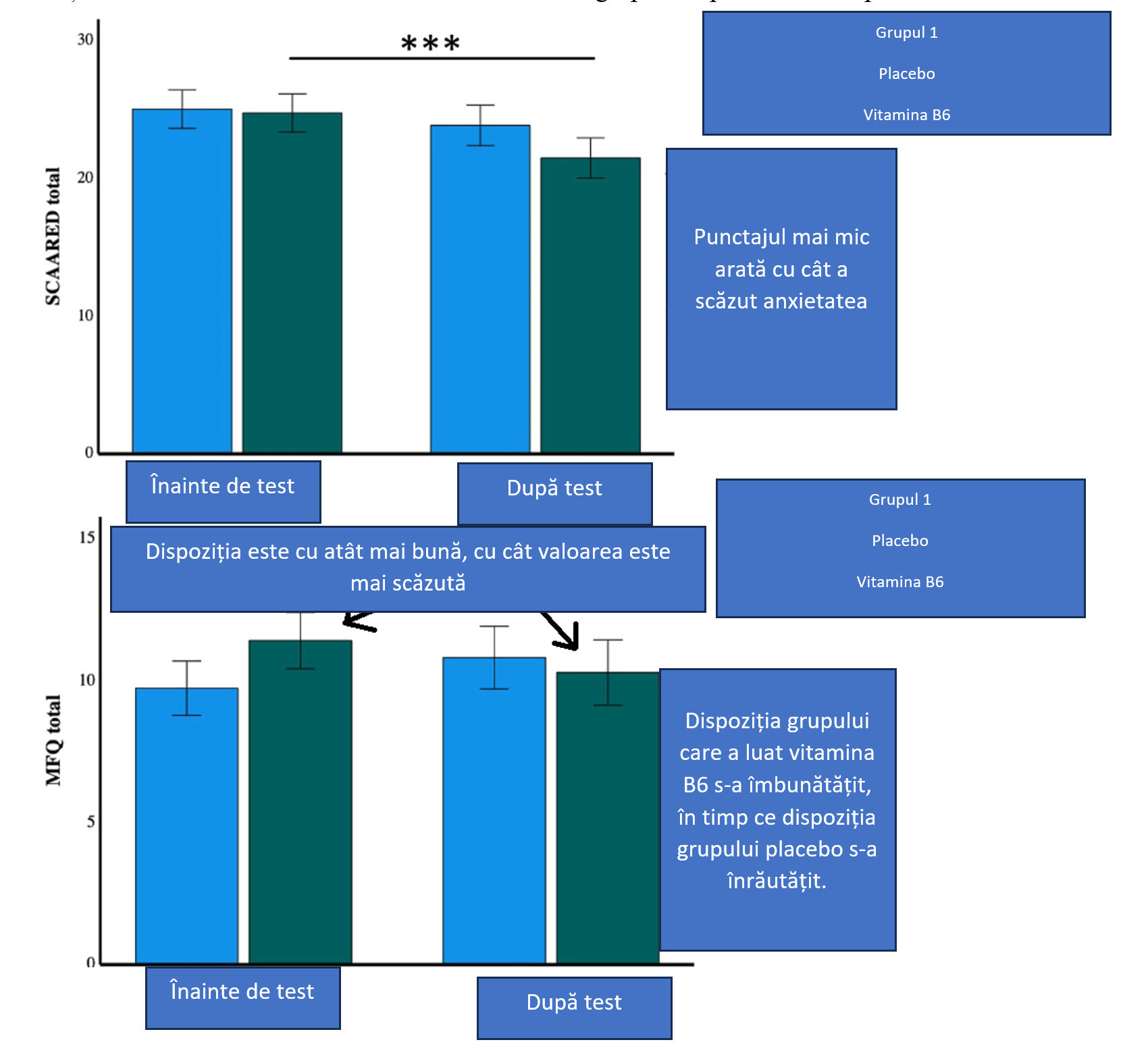 Suplimentarea cu vitamina B6 a redus semnificativ anxietatea participanților și a îmbunătățit dispoziția acestora în ambele teste, comparativ cu grupul placebo. Suplimentarea cu vitamina B12 a fost, de asemenea, eficientă, dar într-un mod mai puțin eficient decât vitamina B6.